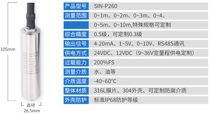 SIN-P260投入式液位變送器由高性能擴(kuò)散硅壓阻式壓力傳感器作為測量元件,把與液位深度成正比的液體靜壓力準(zhǔn)確測量出來。